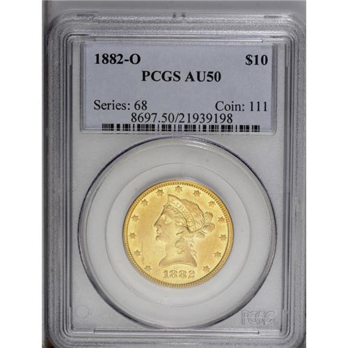 <B>1882-O<$10> AU50 PCGS.</B></I> The pleasing reddish-gold toning reveals intermingled accents of green on both sides. Well struck except for the obverse stars, with moderate wear on the highpoints and numerous small to moderate marks that help to define the grade. Traces of luster remain about the stars and lettering. Just 10,820 examples of this elusive O-mint ten were struck, with most survivors grading in the VF to XF range. Population: 24 in 50, 42 finer (7/06).