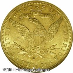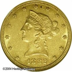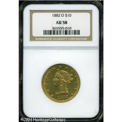 1882-O $10 AU58 NGC. The 1880-O through 1882-O eag <B>1882-O $10 AU58 NGC.</B></I> The 1880-O through 1882-O eagles are very scarce issues. Even after David Akers groundbreaking work twenty plus years ago, these issues still remain largely unappreciated by the larger collecting public. The '82-O is generally unavailable in Uncirculated condition, which makes this AU58 example an excellent buy. Sharply struck throughout, the bright orange-gold surfaces show numerous small to medium sized abrasions over each side and there is a small grease stain (as made) at 12 o'clock on the obverse. Population: 36 in 58, 10 finer (11/04). <BR><BR><B>Important notice:</B> Heritage usually auctions material at the rate of 200-250 lots per hour. On some occasions eBay Live bid software or the Internet may not be able to keep up with the pace of the auction. We recommend placing a realistic absentee bid now as insurance to avoid disappointment. Occasionally the auctioneer may eliminate or reject an eBay Live bid, and the auctioneer may also reopen a lot after the close of the eBay live bidding (usually because we missed an audience bid), and may reject your bid even if it shows you as the winning bidder. By bidding via eBay Live, you agree that Heritage may award the lot to another bidder at its sole discretion under the circumstances described above or any other reasonable circumstances. Since eBay bids are not shown to us until we open the lot on the floor, we treat those bids just like floor bids. In most cases the floor responds before the eBay bid is presented to us, due to Internet lag time, so for consistency we have made it a policy that floor bids are always considered first over tie eBay live bids. Also please note that all Heritage lots purchased through eBay Live carry a 20% Buyer's Premium. Please make sure you read the Terms and Conditions before you bid. This lot is being auctioned in conjunction with a live floor auction by Heritage Galleries & Auctioneers. All final auction and invoice information will be supplied by Heritage Galleries & Auctioneers, and all other information should be considered preliminary. Lot:6759