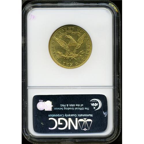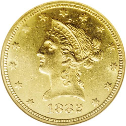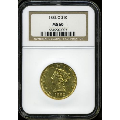 <B>1882-O<$10> MS60 NGC.</B></I> A very rare date to find in high grades, particularly so in any grade of Uncirculated. This coin has full luster and is well struck by the dies. We note scattered handling ticks primarily in the fields, and Liberty's face is reasonably attractive for a coin of this grade. Paltry issue with a mintage of 10,820 pieces, most of which soon found their way to the melting pots. There is a small rough area below the UN of UNITED. For the date collector, the purchase of this coin would make a great addition. Census: 7 in 60, 5 finer (1/06).