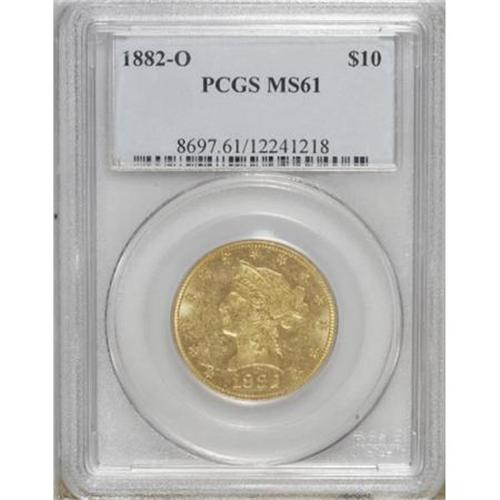 <B>1882-O $10 MS61 PCGS.</B></I> The New Orleans Mint re-opened in 1879 principally to strike silver dollars. One other denomination was coined between 1879 and 1883, the ten dollar. But while millions of Morgan dollars were struck each of those five years at the Southern facility, Liberty eagle production never exceeded the 10,820-piece mintage of the 1882-O. This rare, Mint State example is well struck and displays substantial luster. Both sides have scattered small marks. Population: 4 in 61, 2 finer (12/07).<BR><BR><B>Coin Engraver:</B> Christian Gobrecht<BR><BR><b>Shipping:</b> Coins & Currency (<a target="_blank" href="http://www.heritageauctions.com/common/shipping.php">view shipping information</a>)