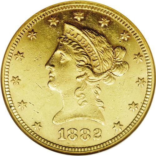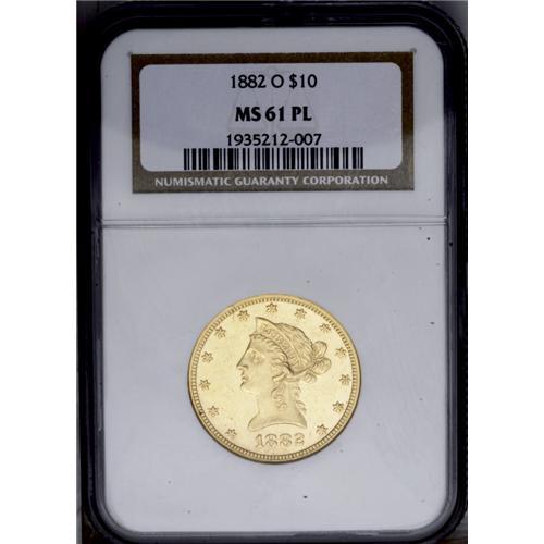 <B>1882-O<$10> MS61 Prooflike NGC.</B></I> The 1882-O is a rarity in any grade, and only a handful of pieces have been certified above the MS60 level. Only 10,820 pieces were struck, and no numismatic consideration was given to them for many years thereafter. Although typically abraded, the present example is sharply struck and possesses flashy prooflike luster. One of just two pieces certified as Prooflike by NGC, both in the MS60 grade.