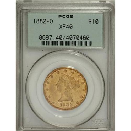 <B>1882-O $10 XF40 PCGS.</B></I> The 1882-O stands in the shadow of the very rare 1883-O, but the 1882-O is also difficult. Only 10,820 pieces were struck, and those were little saved. This old holder example has surprising luster for the grade, and although small marks are scattered, none distract.<BR><BR><B>Coin Engraver:</B> Christian Gobrecht<BR><BR><b>Shipping:</b> Coins & Currency (<a target="_blank" href="http://www.heritageauctions.com/common/shipping.php">view shipping information</a>)