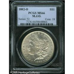 <B>1882-O<img border='0' src='http://www.heritagecoins.com/images/star.gif' width=10 height=10>$1 MS66 PCGS.</B></I> Ex: M.J.O. VAM-7. A Top 100 Variety. The mintmark is widely and boldly repunched south. The 1882-O is quite common in basal Mint State grades, but unlike the Silver Dollars of this same date struck at the other mints, the third party certified population drops precipitously above the MS65 grade. A crisply struck and lustrous premium Gem with faint chestnut color and refreshingly smooth surfaces. Population: 15 in 66, 3 finer (1/05).<BR><I>From The Banks Collection.</B></I> Lot:10087