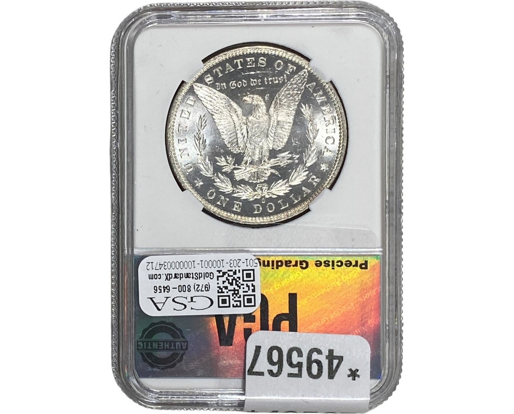e. Coins sold referencing a third-party grading service are sold “AS IS” without any express or implied warranty, except for a guarantee by GSA that they are genuine. Removal or alteration of the holder, voids all of Bidder’s claims concerning that Product. Certain warranties may be available from the grading services and Bidders are referred to them for further details: Numismatic Guaranty Corporation (NGC), PO Box 4776, Sarasota, FL 34230, www.ngccoin.com/services/writtenguarantee.asp; Professional Coin Grading Services (PCGS), PO Box 9458, Newport Beach, CA 92658, www.pcgs.com/guarantee.html; ANACS, 6555 S. Kenton St., Ste. 303, Englewood, CO 80111; and Independent Coin Grading Co. (ICG), 7901 East Bellview, Ave., Suite 50, Englewood, CO 80111.