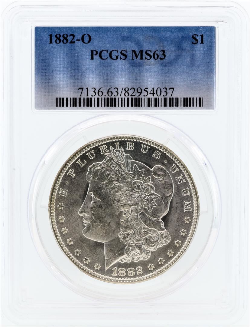One 1882-O PCGS MS63 Morgan Silver Dollar.