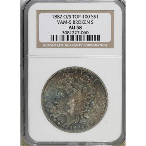 <B>1882-O/S $1 AU58 NGC.</B></I> Top 100 VAM-5 Broken S. NGC Census: (349/1361). PCGS Population (108/1050). Mintage: 1,039. Numismedia Wsl. Price for NGC/PCGS coin in AU58: $100. (#7138)<BR><BR><B>Coin Engraver:</B> George T. Morgan<BR><BR><b>Shipping:</b> Coins & Currency (<a target="_blank" href="http://www.heritageauctions.com/common/shipping.php">view shipping information</a>)