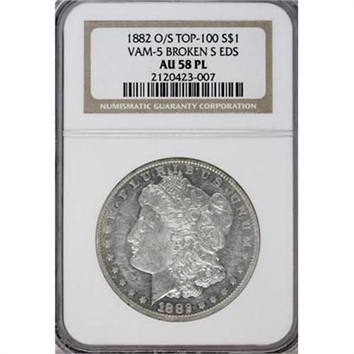 <B>1882-O/S $1 Early Die State Broken S AU58 Prooflike NGC.</B></I> VAM-5. A Top 100 Variety. Per the <I>Top 100</B></I> reference, the "rare early die state shows less of the broken diagonal, and is worth significantly more." This untoned example has minor rim nicks at 6:30 on the obverse and 11:30 on the reverse, but the flashy fields are devoid of relevant marks, and the devices are crisply struck.<BR><BR><b>Shipping:</b> Coins & Currency (<a target="_blank" href="http://www.heritageauctions.com/common/shipping.php">view shipping information</a>)