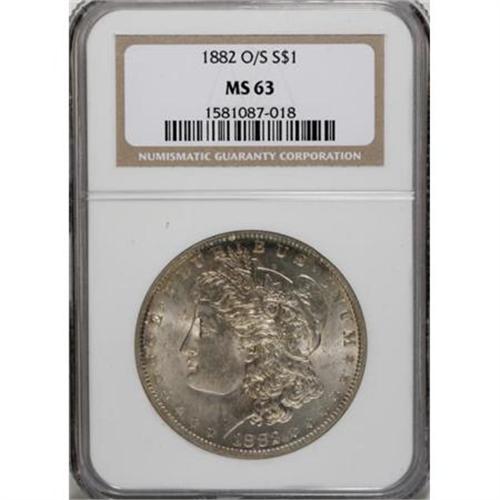 <B>1882-O/S $1 MS63 NGC.</B></I> VAM-3. A Top 100 Variety. The "O/S Flush" VAM. Golden-brown and blue-green margins invigorate this lustrous and attentively struck Select Morgan dollar. Well preserved for the grade.<BR><BR><B>Coin Engraver:</B> George T. Morgan<BR><BR><b>Shipping:</b> Coins & Currency (<a target="_blank" href="http://www.heritageauctions.com/common/shipping.php">view shipping information</a>)