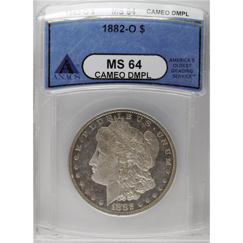 <B>1882-O<img border='0' src='http://www.heritagecoins.com/images/star.gif' width=10 height=10>$1> MS64 Cameo Deep Mirror Prooflike ANACS.</B></I> The eagle is particularly frosty, although the portrait also displays modest contrast with the mirrored obverse field. This intricately struck near-Gem possesses golden-brown and electric-blue peripheral toning.