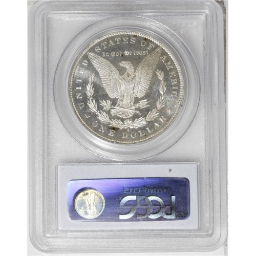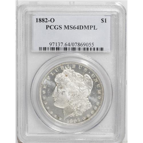 <B>1882-O<img border='0' src='http://www.heritagecoins.com/images/star.gif' width=10 height=10>$1> MS64 Deep Mirror Prooflike PCGS.</B></I> A flashy and deeply mirrored near-Gem with plenty of mint frost. Small patches of brown toning appear on both sides, as do small marks that account for the grade.