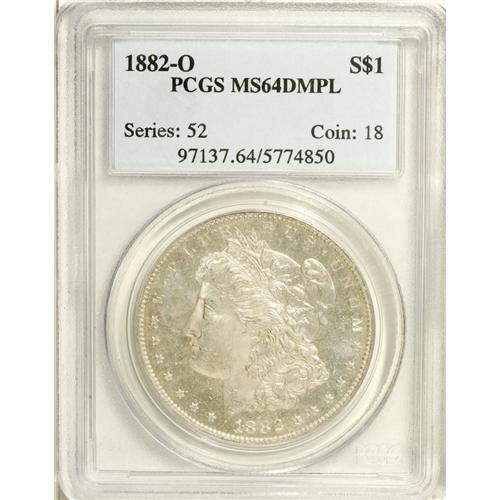 <B>1882-O S$1 MS64 Deep Mirror Prooflike PCGS.</B></I> Sharply struck in Liberty's hair, and on the eagle's breast, it is obvious that this is an early strike, from newly prepared dies, with the fields highly polished, to produce the distinctive prooflike aspect of this specimen. A scarce coin in this state of preservation. Population: 125 in 64, 20 finer (12/06).<BR><BR><b>Shipping:</b> Coin/Currency (<a target="_blank" href="http://www.heritageauctions.com/common/shipping.php">view shipping information</a>)