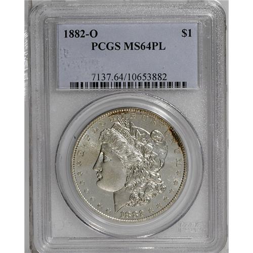 <B>1882-O<img border='0' src='http://www.heritagecoins.com/images/star.gif' width=10 height=10>$1> MS64 Prooflike PCGS.</B></I> A moderately mirrored coin with hazy toning and a fingerprint at 3 o'clock in the obverse field. Nicely struck with russet accents and scattered abrasions that are consistent with the grade.