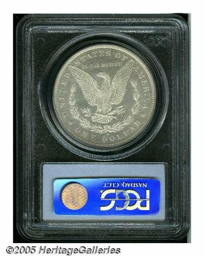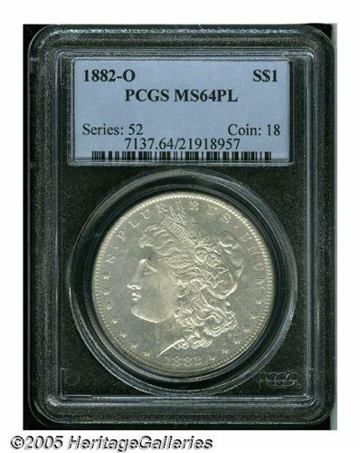 <B>1882-O<S$1> MS64 Prooflike PCGS.</B></I> Sharply struck with a thin layer of milky toning over both sides of the coin. The Prooflike fields are highly reflective, and the obverse and reverse surfaces seem minimally marked, as expected for the assigned grade level. A small dark spot rests just above Liberty's eyebrow. Population: 124 in 64 Prooflike, 20 finer in Prooflike (5/05).