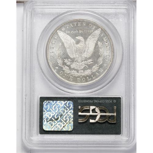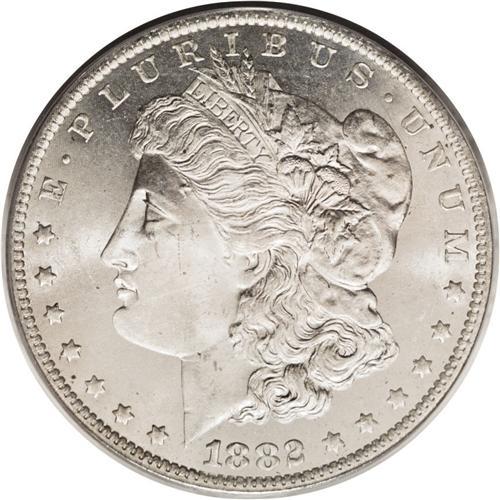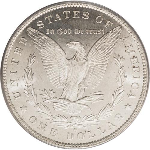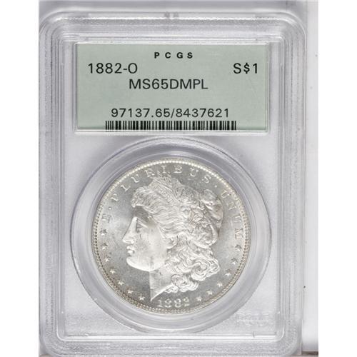 <B>1882-O<img border='0' src='http://www.heritagecoins.com/images/star.gif' width=10 height=10>$1> MS65 Deep Mirror Prooflike PCGS.</B></I> Well-produced examples of this issue are fairly elusive, although prooflike specimens surface from time to time. The present piece is a pleasing exception, with deeply mirrored fields and thickly frosted devices. The strike over the ear is a trifle soft, and a few roller marks appear there as a result. There are few singular abrasions, although some light field chatter is noted. Certified in a green-label holder. Population: 19 in 65 Deep Mirror Prooflike, 1 finer (9/06).