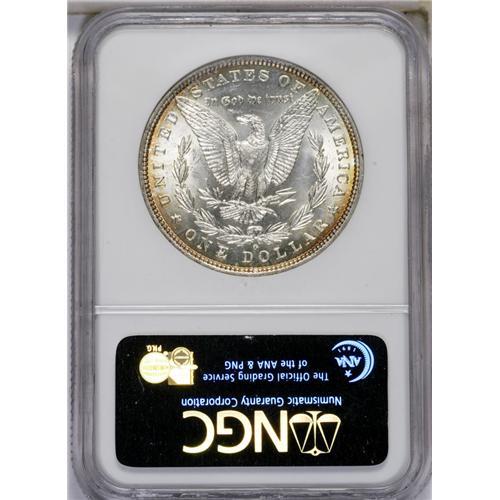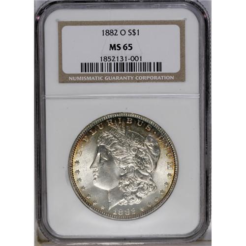 <B>1882-O<img border='0' src='http://www.heritagecoins.com/images/star.gif' width=10 height=10>$1> MS65 NGC.</B></I> Attractive golden-brown and ocean-blue toning invigorates the borders of this lustrous and penetratingly struck Gem. The obverse is particularly pleasing. Although the 1882-O has a common reputation, the issue is scarce as a Gem and rare any finer.