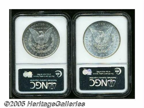 <B>1882-O<S$1> MS65 NGC,</B></I> and an <B>1884 MS66 NGC,</B></I> both pieces are essentially brilliant, though the '82-O displays a touch of light tan near the date, and the '84 exhibits a few minute marks on Liberty's face.