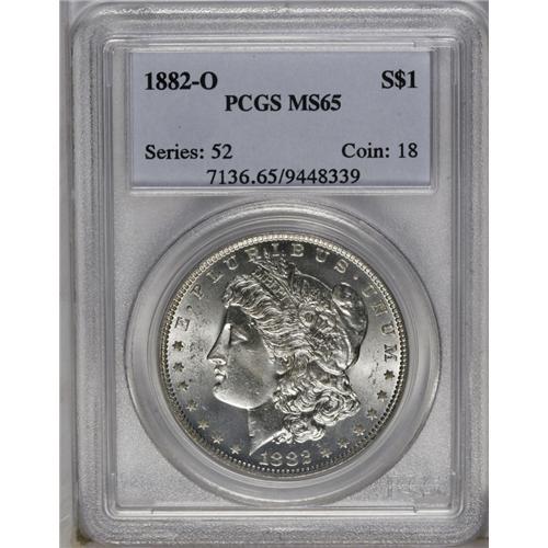 <B>1882-O<img border='0' src='http://www.heritagecoins.com/images/star.gif' width=10 height=10>$1> MS65 PCGS.</B></I> Satiny luster, bright for this issue radiates from both sides of this well preserved Gem. Only a few marks appear in the untoned fields. As usual, the strike is bold.<BR><I>From The Chicago-Ark Collection.</B></I>
