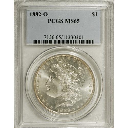 <B>1882-O S$1 MS65 PCGS.</B></I> The 1882-O Morgan is common through MS64, as evidenced by the thousands of pieces that have been certified by PCGS and NGC. A precipitous drop occurs at the MS65 level, and higher-grade coins are rare. The Gem offered in this lot displays lustrous surfaces with wisps of faded purple toning clinging to the rim areas. This example exhibits an above-average strike, as partial definition is visible in the hair over Liberty's ear and on the eagle's breast feathers. A few minor marks on the cheek prevent an even higher grade.<BR><BR><b>Shipping:</b> Coins & Currency (<a target="_blank" href="http://www.heritageauctions.com/common/shipping.php">view shipping information</a>)