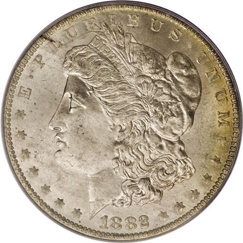 <B>1882-O S$1 MS66 PCGS.</B></I> Ex: Shapiro. A light patina of tangerine and lavender iridescence drape the obverse, while the faintest hint of peripheral gold frames an untoned central reverse. Sharply struck and lustrous with significant eye appeal. A tiny planchet flaw at the base of Liberty's neck is noted for accuracy.<BR><BR><b>Shipping:</b> Coin/Currency (<a target="_blank" href="http://www.heritageauctions.com/common/shipping.php">view shipping information</a>)