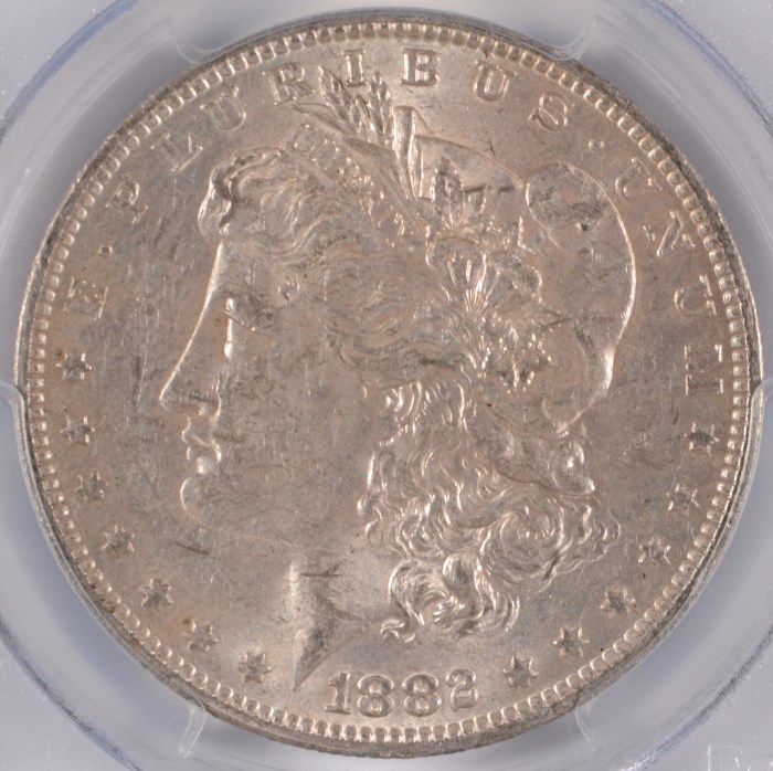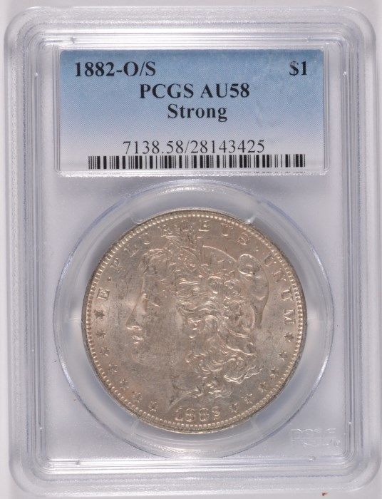 1882-O/S MORGAN SILVER DOLLAR, PCGS AU-58 NICE!!