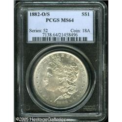 <B>1882-O/S<img border='0' src='http://www.heritagecoins.com/images/star.gif' width=10 height=10>$1 MS64 PCGS.</B></I> VAM-4. A Top 100 variety. Frosty and lustrous, with surfaces that are generally untoned save for a blush of light gold and gray. The strike is sharp throughout and the surfaces are pleasing to examine. One of the most popular of the varieties and most collectors include this in their date collections of Morgan silver dollars. Population: 179 in 64, 1 finer (1/05). Lot:10092