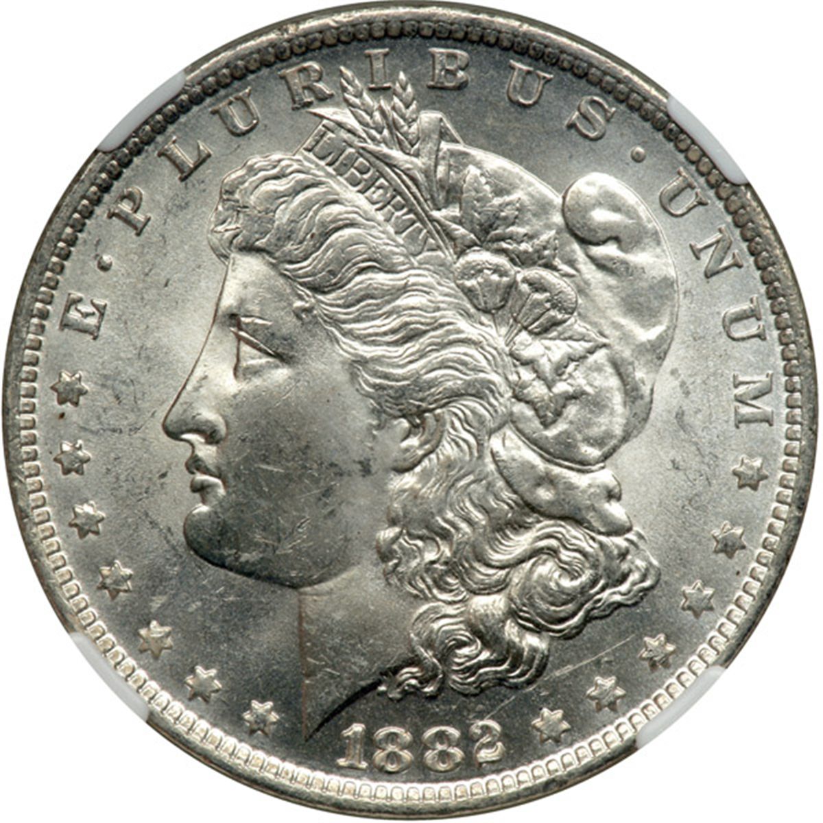 1882-O/S Morgan Dollar. NGC graded MS-64. A choice white specimen. A popular overmintmark coin, one of two in the series, the other being the 1900-O/CC. Pop 219; 6 finer in 65 (PCGS # 7138) .