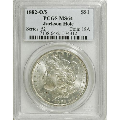 <B>1882-O/S S$1 MS64 PCGS.</B></I> Ex: Jackson Hole. VAM-4. A Top 100 Variety. The crossbar of the S is clearly visible beneath the midpoint of the open loop of the O. Although not noted on the insert, this is the Strong O/S variety. The present example is brilliant, with minimal marks for the grade and a good strike, particularly on the eagle's breast. An elusive VAM variety that is virtually unobtainable any finer. In fact, PCGS has certified only a <I>single</B></I> Gem example.<BR><I>From The Jackson Hole Collection.</B></I><BR><BR><b>Shipping:</b> Coins & Currency (<a target="_blank" href="http://www.heritageauctions.com/common/shipping.php">view shipping information</a>)