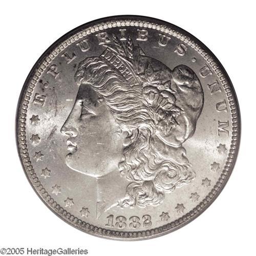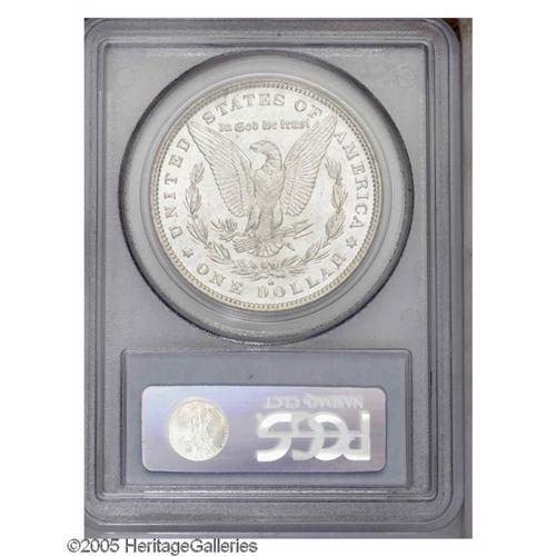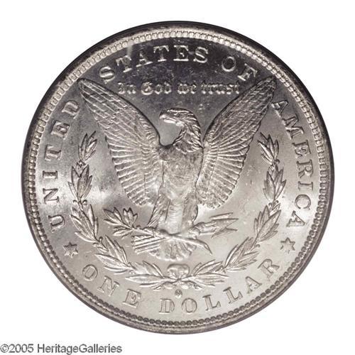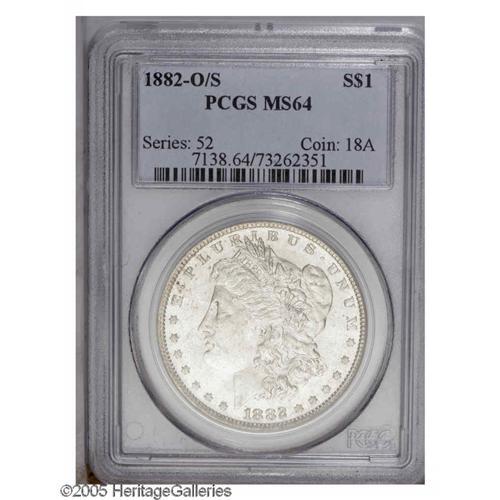 <B>1882-O/S<S$1> MS64 PCGS.</B></I> VAM-4. A Top 100 Variety. A frosty white coin that boasts strong luster, a good strike, and excellent eye appeal. Note the quality of Liberty's cheek and neck, for rarely are these large open areas so free of contact marks or nicks. A strong loupe will note a scattering of small raised lumps. These were caused by the dies rusting slightly, and are present both on Liberty's face (forehead, eye, neck) and on the eagle. The overmintmark feature is clear, with the center of the S quite plain within the O. Exceedingly difficult to obtain any finer, with just eleven Gems certified by NGC and PCGS combined (10/05).