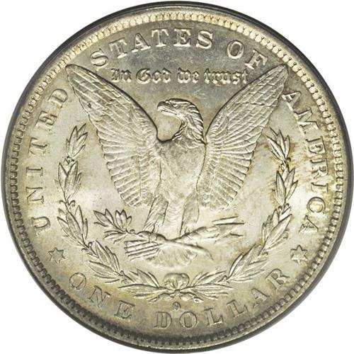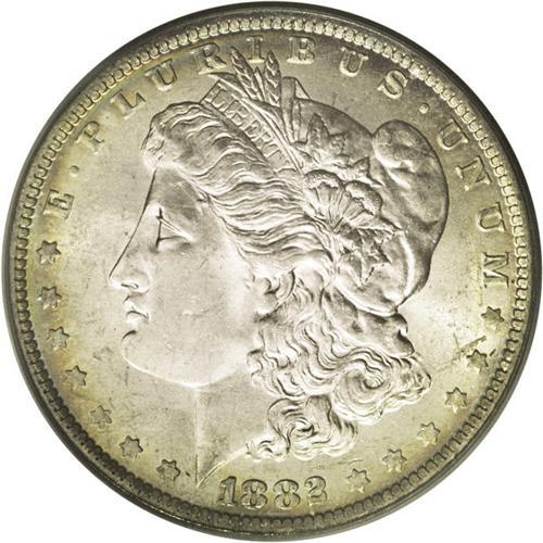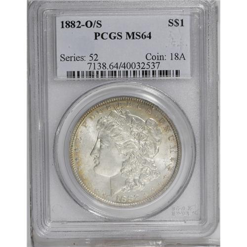 <B>1882-O/S<img border='0' src='http://www.heritagecoins.com/images/star.gif' width=10 height=10>$1> MS64 PCGS.</B></I> VAM-4. A Top 100 Variety. A lovely near-Gem with pretty peripheral toning in amber-gold and ice-blue hues. Despite a couple of small luster breaks and luster that is just a bit subdued, this piece is attractive and free of distracting abrasions. A nice coin, with the overmintmark bold.