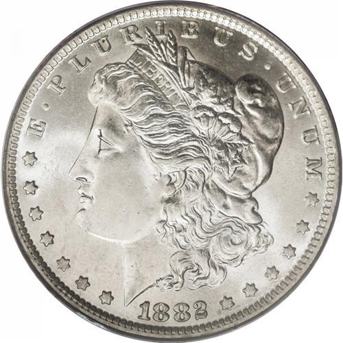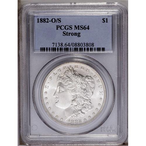<B>1882-O/S<img border='0' src='http://www.heritagecoins.com/images/star.gif' width=10 height=10>$1> MS64 PCGS.</B></I> VAM-4. A Top 100 Variety. The "O/S Recessed" or Strong overmintmark, with the center of the S clearly present within the lower half of the inner loop of the New Orleans mintmark. This satiny-white representative is very well struck and possesses outstanding luster for the issue. Nearly unobtainable finer. <BR><BR><B>Important notice:</B> Heritage usually auctions material at the rate of 200-250 lots per hour. On some occasions eBay Live bid software or the Internet may not be able to keep up with the pace of the auction. We recommend placing a realistic absentee bid now as insurance to avoid disappointment. Occasionally the auctioneer may eliminate or reject an eBay Live bid, and the auctioneer may also reopen a lot after the close of the eBay live bidding (usually because we missed an audience bid), and may reject your bid even if it shows you as the winning bidder. By bidding via eBay Live, you agree that Heritage may award the lot to another bidder at its sole discretion under the circumstances described above or any other reasonable circumstances. Since eBay bids are not shown to us until we open the lot on the floor, we treat those bids just like floor bids. In most cases the floor responds before the eBay bid is presented to us, due to Internet lag time, so for consistency we have made it a policy that floor bids are always considered first over tie eBay live bids. Also please note that all Heritage lots purchased through eBay Live carry a 20% Buyer's Premium. Please make sure you read the Terms and Conditions before you bid. This lot is being auctioned in conjunction with a live floor auction by Heritage Galleries & Auctioneers. All final auction and invoice information will be supplied by Heritage Galleries & Auctioneers, and all other information should be considered preliminary. Lot:3351 <BR><BR><B>Winning Notification and Billing:</B> After the FINAL session in this auction is complete, Heritage will send e-mail and snail mail invoices. This process normally takes several days. All final auction and invoice information will be supplied by Heritage Galleries & Auctioneers, and all other information should be considered preliminary. <BR><BR>This auction will be conducted on a live auction floor and over the Internet through eBay Live. If you choose to place an absentee bid, please take a moment to <font color='#0000ff'><u><a href='http://pages.ebay.com/liveauctions/help/before/laabsentee.html'>learn how eBay Live absentee bidding works</a></u></font><font color='#000000'>