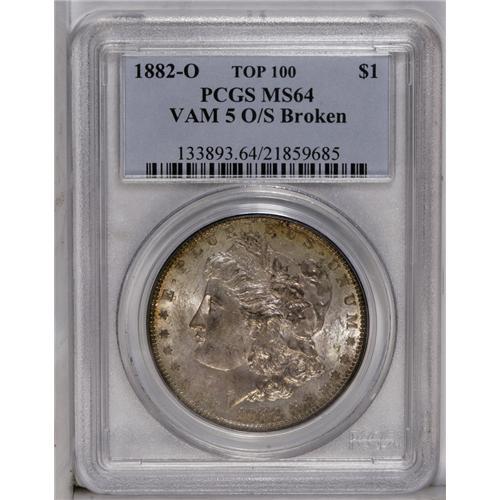 <B>1882-O/S<img border='0' src='http://www.heritagecoins.com/images/star.gif' width=10 height=10>$1> Weak MS64 PCGS.</B></I> VAM-5. A Top 100 Variety. The "broken" O/S overmintmark. A nicely struck and minimally marked example with translucent lilac, gray, and golden-brown patina.