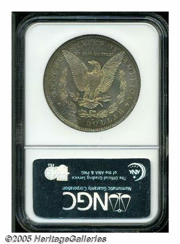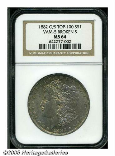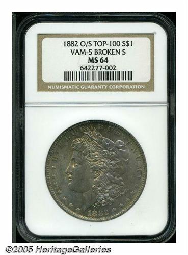 <B>1882-O/S<S$1> Weak MS64 NGC.</B></I> VAM-5. A Top 100 Variety. The "Broken S" variant of the 1882-O/S. Both sides are luxuriously toned in peach, lilac, and apple-green colors, nonetheless, the mint luster is pronounced, and the reverse is clean for the assigned grade. Conditionally rare, according to NGC census data, most examples of VAM-5 are in AU58 to MS63 grades. Population: 16 in 64, 2 finer (3/05).