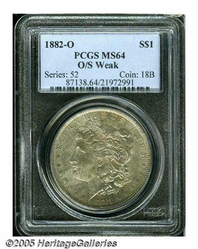 <B>1882-O/S<S$1> Weak MS64 PCGS.</B></I> VAM-5. A Top 100 Variety. While not as prominent as the "Strong" O/S, the broken S is, nevertheless, apparent within the O with light magnification. Bright mint luster is overlaid with rich teal and rose toning on the obverse, while the reverse is almost completely brilliant. Lightly abraded with slight softness in the centers. Tied for finest certified among the Weak O/S dollars. Population: 25 in 64, 0 finer (6/05).