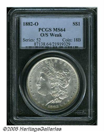 <B>1882-O/S<S$1> Weak MS64 PCGS.</B></I> VAM-5. Top 100 Variety. A fragment of an S undermintmark is noted within the loop of the primary O mintmark. A meticulously struck, fully brilliant, and frosty piece. Attractive despite a few grade-limiting luster grazes on the cheek. Currently, this is tied with 24 other specimens at PCGS as the finest known, (6/05).