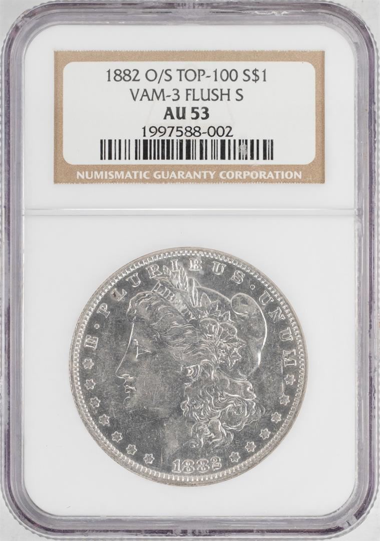 One 1882-O/S VAM-3 Flush S $1 Morgan Silver Dollar Coin NGC AU53. NGC Certified.