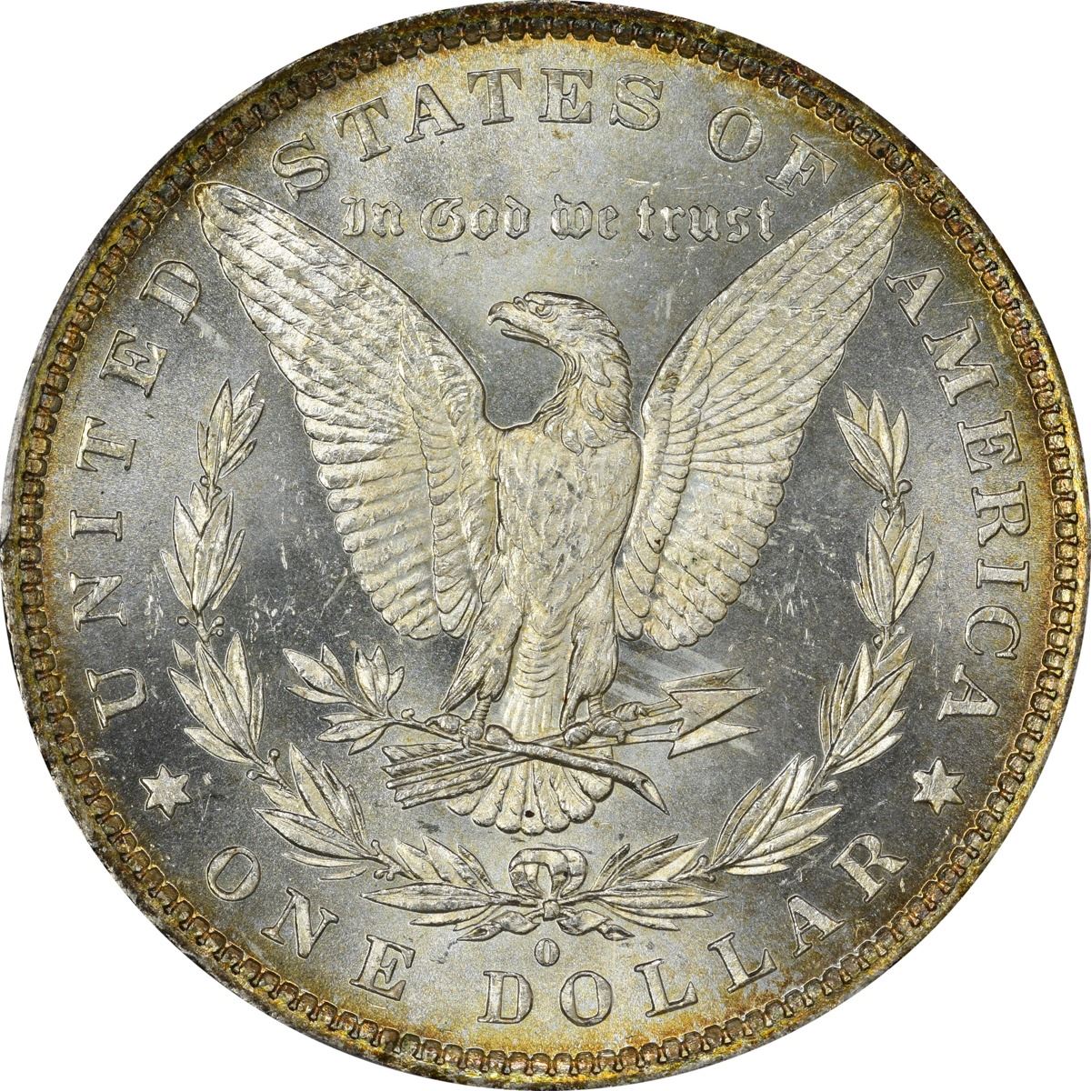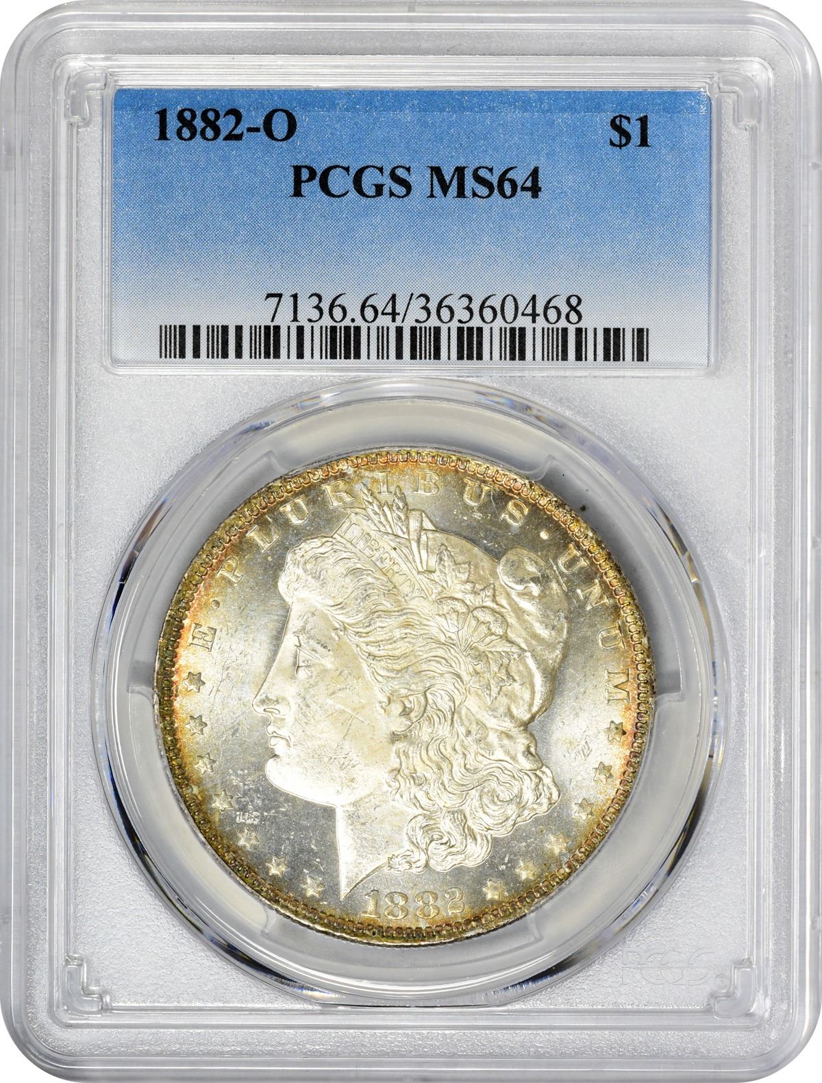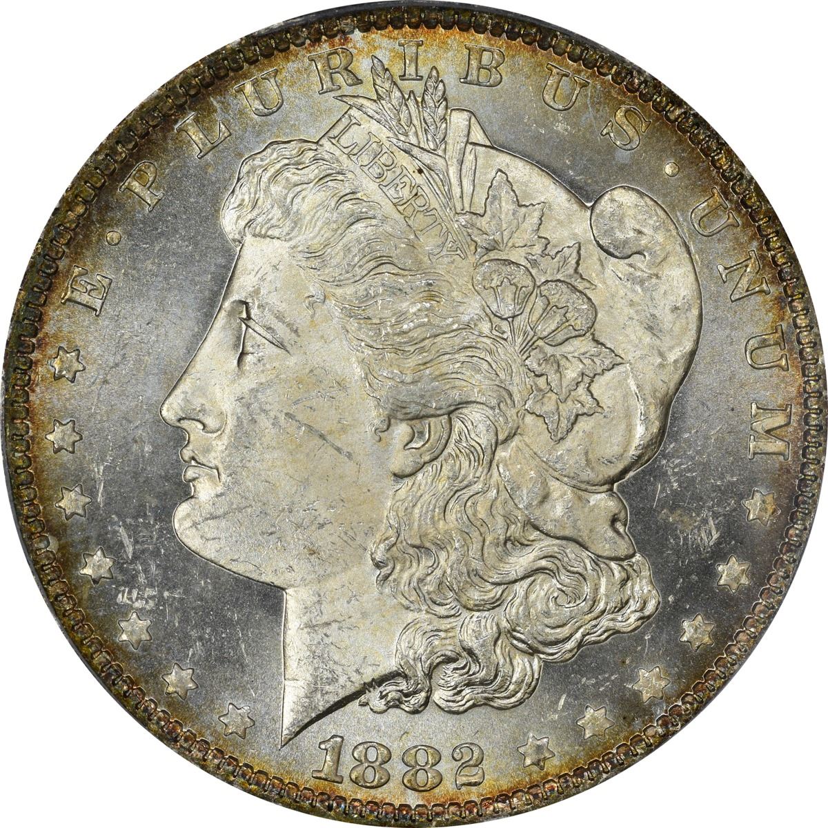 A downright attractive example of the date, this specimen offers frosty and brilliant centers encircled by rich sunset-orange iridescence at the rims, and shares these lively features on both sides. The fields are satiny and just shy of reflective and offer bold cartwheel activity throughout. PCGS #7136