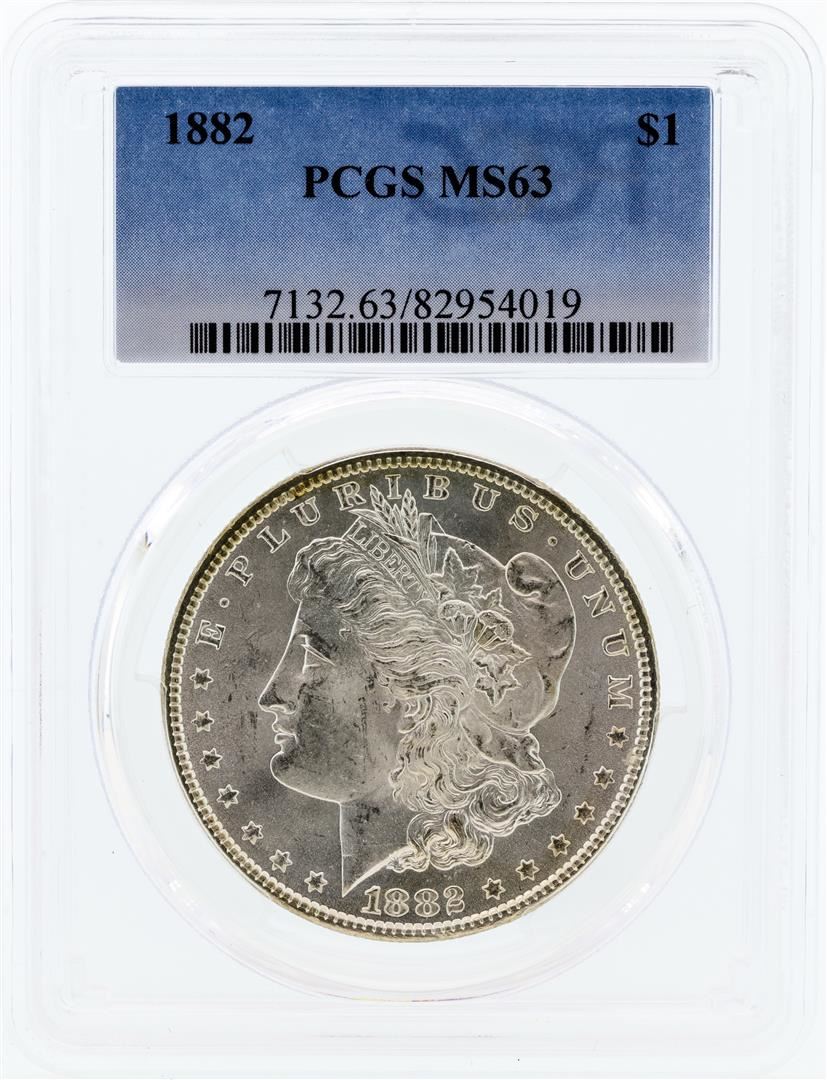 One 1882 PCGS MS63 Morgan Silver Dollar.