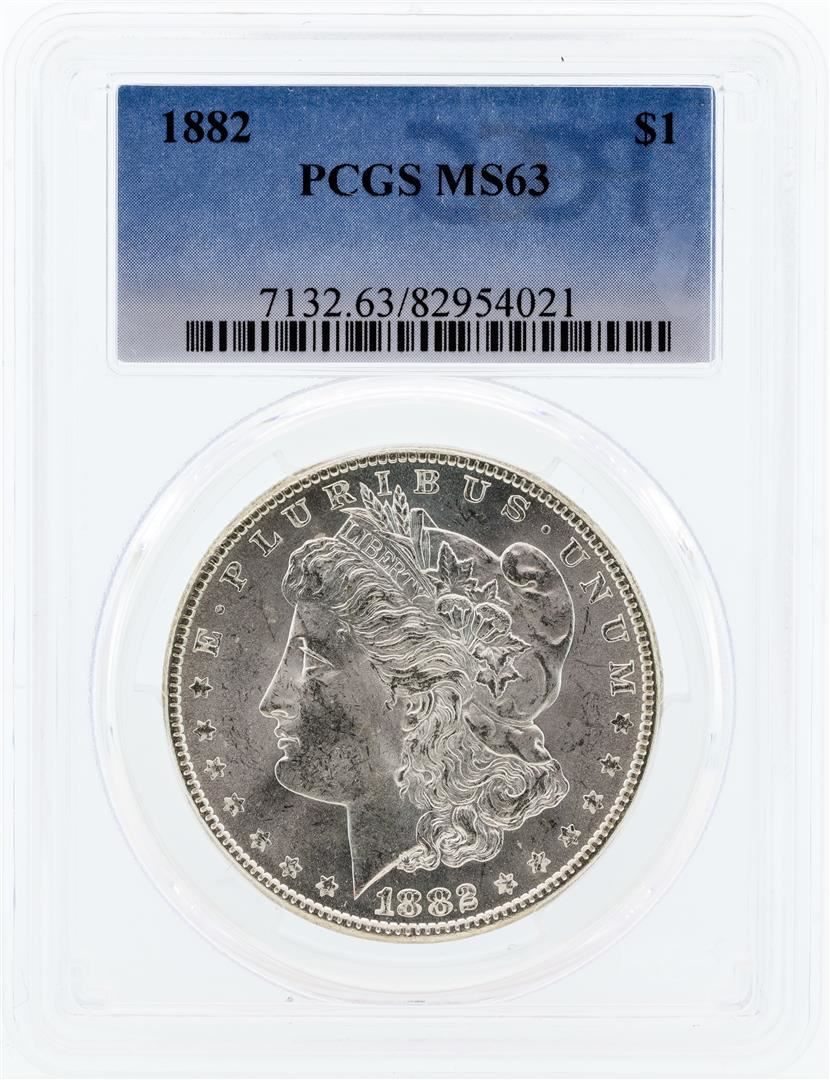 One 1882 PCGS MS63 Morgan Silver Dollar.