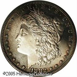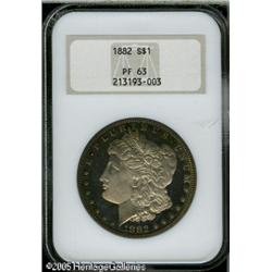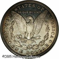 <B>1882<img border='0' src='http://www.heritagecoins.com/images/star.gif' width=10 height=10>$1 PR63 NGC.</B></I> Here is a very pleasing coin for the grade which is enhanced by deep peripheral blue toning and light gold nearby while Liberty's head is generally white and well frosted by the dies. Minor hairlines account for the grade. Lot:10652