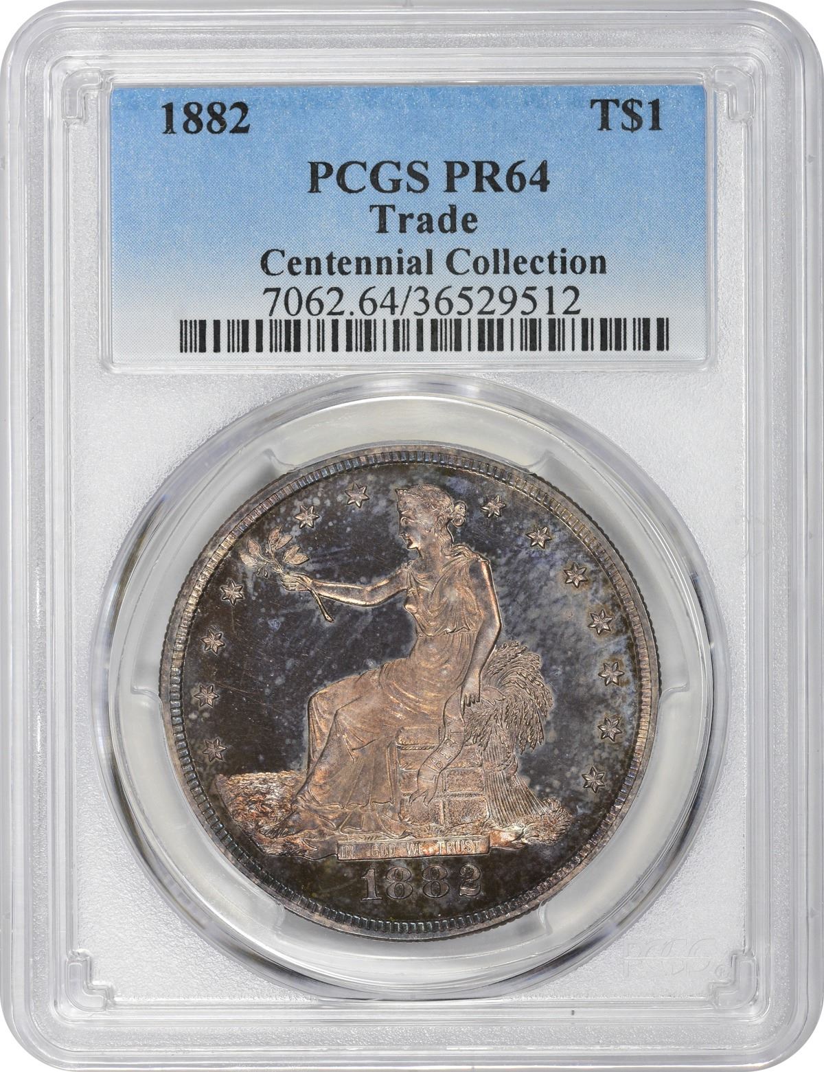 An exceptionally lovely and colorful example of this popular Proof-only date. The intensely mirrored fields and frosted motifs are fairly alive with bright crimson, violet, and blue iridescence across both sides. The strike is as sharp as ever seen for the type. If you appreciate toned 19th-century silver coinage, you’ll need to take a look at this one. PCGS #7062