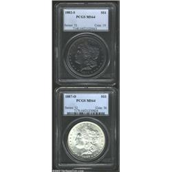 <TR><TD width="100%"><TABLE cellSpacing=1 cellPadding=3 width="100%" border=0><TBODY><TR><TD width="100%" bgColor=#79735c><FONT face=arial color=#ffffff size=3><B>Description</B> </FONT></TD></TR><TR><TD width="100%" bgColor=#ffffff><FONT face=arial size=2><B>1882-S $1 MS64 PCGS,</B></I> the obverse has outrageously deep mauve, ruby-red, and lime-green patina, the reverse is dominate by golden-brown colors, well struck with moderately prooflike fields; and an <B>1887-O MS64 PCGS,</B></I> brilliant and lustrous with a bold strike and impressive preservation. (2 coins) </FONT></TD></TR></TBODY></TABLE></TD></TR></TBODY></TABLE><BR><A name=PricesRealized></A><TABLE cellSpacing=0 cellPadding=0 width="100%" bgColor=#000000 border=0><TBODY><TR><TD width="100%"><TABLE cellSpacing=1 cellPadding=3 width="100%" border=0><TBODY><TR><TD width="100%" bgColor=#79735c><A name=PR><FONT face=arial color=#ffffff size=3><B>Previous Prices from Heritage Auctions</B> </FONT></A></TD></TR><TR><TD bgColor=#f6f6ed><TABLE cellSpacing=0 cellPadding=0 width="100%" border=1><TBODY><TR><TD align=middle width="33%"><B>Date</B></TD><TD align=middle width="33%"><B>Service</B></TD><TD align=middle width="33%"><B>Price</B></TD></TR><TR bgColor=whitesmoke><TD width="33%"><B>09/24/2002</B></TD><TD width="33%">PCGS</TD><TD width="33%">$29.90</TD></TR><TR bgColor=whitesmoke><TD width="33%"><B>06/10/2002</B></TD><TD width="33%">PCGS</TD><TD width="33%">$155.25</TD></TR><TR bgColor=whitesmoke><TD width="33%"><B>04/23/2002</B></TD><TD width="33%">PCGS</TD><TD width="33%">$36.80</TD></TR><TR bgColor=whitesmoke><TD width="33%"><B>04/23/2002</B></TD><TD width="33%">PCGS</TD><TD width="33%">$46.00</TD></TR><TR bgColor=whitesmoke><TD width="33%"><B>04/16/2002</B></TD><TD width="33%">PCGS</TD><TD width="33%">$33.35</TD></TR><TR bgColor=whitesmoke><TD width="33%"><B>04/16/2002</B></TD><TD width="33%">PCGS</TD><TD width="33%">$37.95</TD></TR><TR bgColor=whitesmoke><TD width="33%"><B>03/12/2002</B></TD><TD width="33%">PCGS</TD><TD width="33%">$43.70</TD></TR><TR bgColor=whitesmoke><TD width="33%"><B>06/02/2001</B></TD><TD width="33%">PCGS</TD><TD width="33%">$51.75</TD></TR><TR bgColor=whitesmoke><TD width="33%"><B>01/09/2001</B></TD><TD width="33%">PCGS</TD><TD width="33%">$50.00</TD></TR><TR bgColor=whitesmoke><TD width="33%"><B>07/04/2000</B></TD><TD width="33%">PCGS</TD><TD width="33%">$330.00</TD></TR><TR bgColor=whitesmoke><TD width="33%"><B>02/22/2000</B></TD><TD width="33%">PCGS</TD><TD width="33%">$40.00</TD></TR><TR bgColor=whitesmoke><TD width="33%"><B>03/04/2003</B></TD><TD width="33%">PCGS</TD><TD width="33%">$47.15</TD></TR><TR bgColor=whitesmoke><TD width="33%"><B>04/01/2003</B></TD><TD width="33%">PCGS</TD><TD width="33%">$56.35</TD></TR><TR bgColor=whitesmoke><TD width="33%"><B>03/01/2003</B></TD><TD width="33%">PCGS</TD><TD width="33%">$517.50</TD></TR><TR bgColor=whitesmoke><TD width="33%"><B>10/01/2002</B></TD><TD width="33%">NGC</TD><TD width="33%">$36.80</TD></TR><TR bgColor=whitesmoke><TD width="33%"><B>04/23/2002</B></TD><TD width="33%">NGC</TD><TD width="33%">$36.80</TD></TR><TR bgColor=whitesmoke><TD width="33%"><B>05/23/2000</B></TD><TD width="33%">NGC</TD><TD width="33%">$35.00</TD></TR><TR bgColor=whitesmoke><TD width="33%"><B>01/18/2000</B></TD><TD width="33%">NGC</TD><TD width="33%">$35.00</TD></TR><TR bgColor=whitesmoke><TD width="33%"><B>01/04/2000</B></TD><TD width="33%">NGC</TD><TD width="33%">$40.00</TD></TR><TR bgColor=whitesmoke><TD width="33%"><B>11/07/1998</B></TD><TD width="33%">NGC</TD><TD width="33%">$49.50</TD></TR><TR bgColor=whitesmoke><TD width="33%"><B>06/04/2002</B></TD><TD width="33%">ANACS</TD><TD width="33%">$42.55</TD></TR><TR bgColor=whitesmoke><TD width="33%"><B>06/26/2001</B></TD><TD width="33%">ANACS</TD><TD width="33%">$39.00</TD></TR><TR bgColor=whitesmoke><TD width="33%"><B>06/26/2001</B></TD><TD width="33%">ANACS</TD><TD width="33%">$36.00</TD></TR><TR bgColor=whitesmoke><TD width="33%"><B>02/13/2001</B></TD><TD width="33%">ANACS</TD><TD width="33%">$45.00</TD></TR><TR bgColor=whitesmoke><TD width="33%"><B>08/22/2000</B></TD><TD width="33%">ANACS</TD><TD width="33%">$45.00</TD></TR></TBODY></TABLE></TD></TR><TR><TD bgColor=#ffffff><FONT face=arial size=1 ?>PLEASE NOTE: All prices realized reflect the final hammer price PLUS the buyer's premium in auctions that charge a buyer's premium. Each item has a notation at the top of the listing indicating whether that lot included a buyer's premium. Example: A item that sells with a final hammer price of $100 and a 20% buyer's premium will display with a price realized of $120. All information listed is intended to be as accurate as possible, but errors are possible. Please use this guide carefully and inform us of any inaccuracies. </FONT></TD></TR></TBODY></TABLE></TD></TR></TBODY></TABLE><BR><TABLE cellSpacing=0 cellPadding=0 width="100%" bgColor=#000000 border=0><TBODY><TR><TD width="100%"><TABLE cellSpacing=1 cellPadding=3 width="100%" border=0><TBODY><TR><TD width="100%" bgColor=#79735c colSpan=6><FONT face=arial color=#ffffff size=3><B>Price Guide*</B> </FONT></TD></TR><TR bgColor=#f6f6ed><TD align=middle><B>Grade</B> </TD><TD align=middle><B>Coin World<BR>(Trends)</B> </TD><TD align=middle><B>Numismedia<BR>Retail</B> </TD><TD align=middle><B>Numismedia<BR>Wholesale</B> </TD><TD align=middle><B>Coin<BR>Universe</B> </TD><TD align=middle><B>Heritage<BR>Value Index</B> </TD></TR><TR><TD colSpan=6>No Pricing Data Available</TD></TR><TR bgColor=#ffffff><TD colSpan=6><FONT size=1>*All information listed is intended to be as accurate as possible, but errors are possible. No item may be returned or refused based on this information which is provided as a service to our customers. You should contact each pricing source directly to determine the accuracy of this information. </FONT></TD></TR></TBODY></TABLE></TD></TR></TBODY></TABLE><BR><TABLE cellSpacing=0 cellPadding=0 width="100%" bgColor=#000000 border=0><TBODY><TR><TD width="100%"><