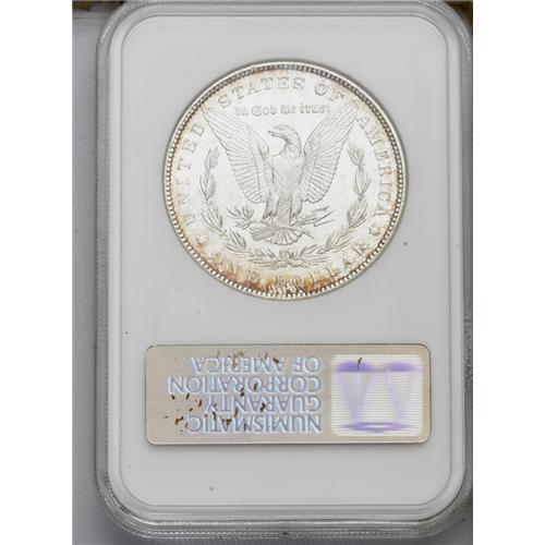 <B>1882<img border='0' src='http://www.heritagecoins.com/images/star.gif' width=10 height=10>$1> MS65 NGC.</B></I> Radiantly lustrous surfaces are visited by whispers of lavender and golden-brown toning along portions of the border areas, and exhibit adequately brought up design elements. Some minor contact marks and luster grazes are noted on Liberty's cheek and in the left obverse and right reverse fields.