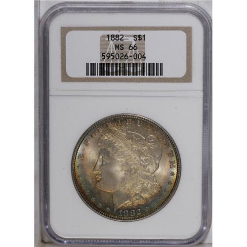 <B>1882<img border='0' src='http://www.heritagecoins.com/images/star.gif' width=10 height=10>$1> MS66 NGC.</B></I> Peach, sky-blue, radish-red, and plum patina invigorates this lustrous and exactingly struck Premium Gem. A lovely silver dollar. The 1882 is considered common, but NGC has certified only eight pieces in finer grades (9/06).