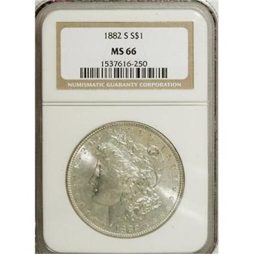 <B>1882-S $1 MS66 NGC.</B></I> NGC Census: (5134/1304). PCGS Population (3736/587). Mintage: 9,250,000. Numismedia Wsl. Price for NGC/PCGS coin in MS66: $248. (#7140)<BR><BR><B>Coin Engraver:</B> George T. Morgan<BR><BR><b>Shipping:</b> Coins & Currency (<a target="_blank" href="http://www.heritageauctions.com/common/shipping.php">view shipping information</a>\)