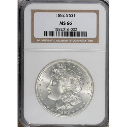 <B>1882-S $1 MS66 NGC.</B></I> NGC Census: (5139/1311). PCGS Population (3747/585). Mintage: 9,250,000. Numismedia Wsl. Price for NGC/PCGS coin in MS66: $248. (#7140)<BR><BR><B>Coin Engraver:</B> George T. Morgan<BR><BR><b>Shipping:</b> Coins & Currency (<a target="_blank" href="http://www.heritageauctions.com/common/shipping.php">view shipping information</a>)