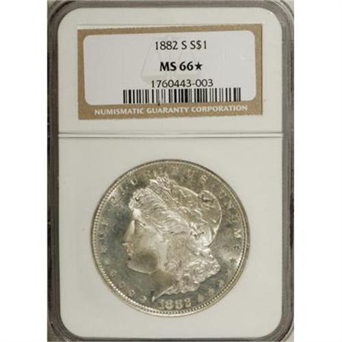 <B>1882-S $1 MS66</B></I> S<B> NGC.</B></I> NGC Census: (5133/1306). PCGS Population (3741/585). Mintage: 9,250,000. Numismedia Wsl. Price for NGC/PCGS coin in MS66: $248. (#7140)<BR><BR><B>Coin Engraver:</B> George T. Morgan<BR><BR><b>Shipping:</b> Coins & Currency (<a target="_blank" href="http://www.heritageauctions.com/common/shipping.php">view shipping information</a>)
