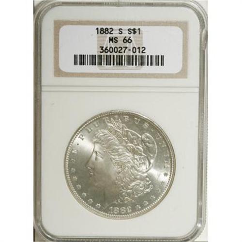 <B>1882-S $1 MS66 NGC.</B></I> NGC Census: (5136/1322). PCGS Population (3775/597). Mintage: 9,250,000. Numismedia Wsl. Price for NGC/PCGS coin in MS66: $240. (#7140)<BR><BR><B>Coin Engraver:</B> George T. Morgan<BR><BR><b>Shipping:</b> Coins & Currency (<a target="_blank" href="http://www.heritageauctions.com/common/shipping.php">view shipping information</a>)
