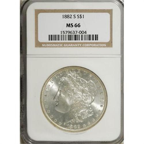 <B>1882-S $1 MS66 NGC.</B></I> NGC Census: (5231/1356). PCGS Population (3814/603). Mintage: 9,250,000. Numismedia Wsl. Price for NGC/PCGS coin in MS66: $240. (#7140)<BR><BR><B>Coin Engraver:</B> George T. Morgan<BR><BR><b>Shipping:</b> Coins & Currency (<a target="_blank" href="http://www.heritageauctions.com/common/shipping.php">view shipping information</a>)