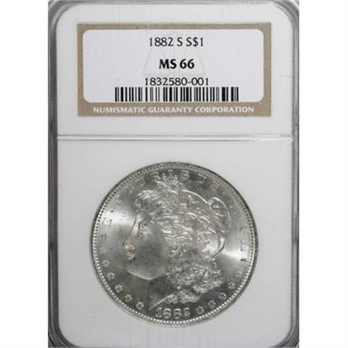 <B>1882-S $1 MS66 NGC.</B></I> NGC Census: (5228/1362). PCGS Population (3818/602). Mintage: 9,250,000. Numismedia Wsl. Price for NGC/PCGS coin in MS66: $240. (#7140)<BR><BR><B>Coin Engraver:</B> George T. Morgan<BR><BR><b>Shipping:</b> Coins & Currency (<a target="_blank" href="http://www.heritageauctions.com/common/shipping.php">view shipping information</a>)