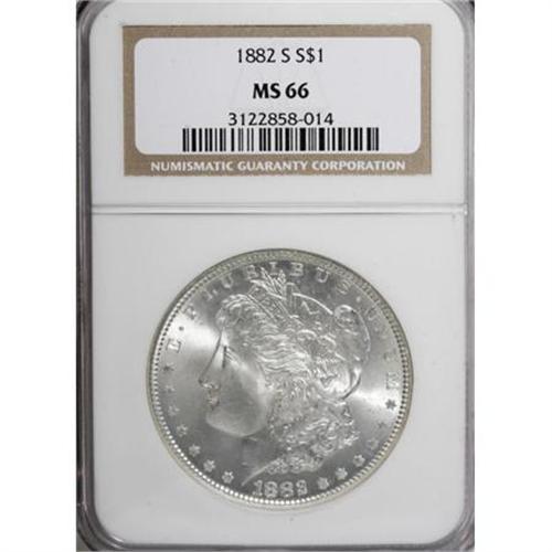 <B>1882-S $1 MS66 NGC.</B></I> NGC Census: (5242/1369). PCGS Population (3835/603). Mintage: 9,250,000. Numismedia Wsl. Price for NGC/PCGS coin in MS66: $240. (#7140)<BR><BR><B>Coin Engraver:</B> George T. Morgan<BR><BR><b>Shipping:</b> Coins & Currency (<a target="_blank" href="http://www.heritageauctions.com/common/shipping.php">view shipping information</a>)